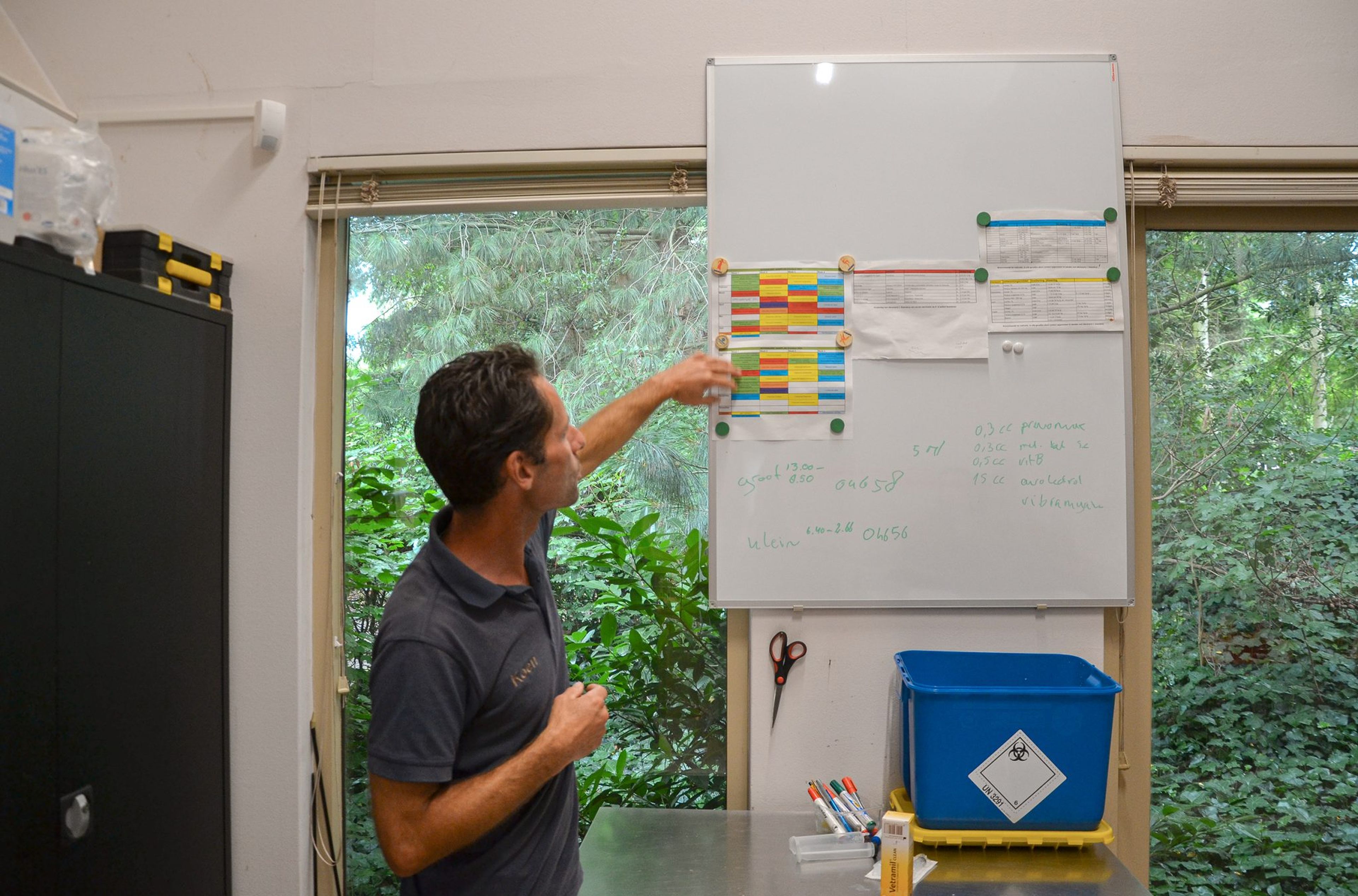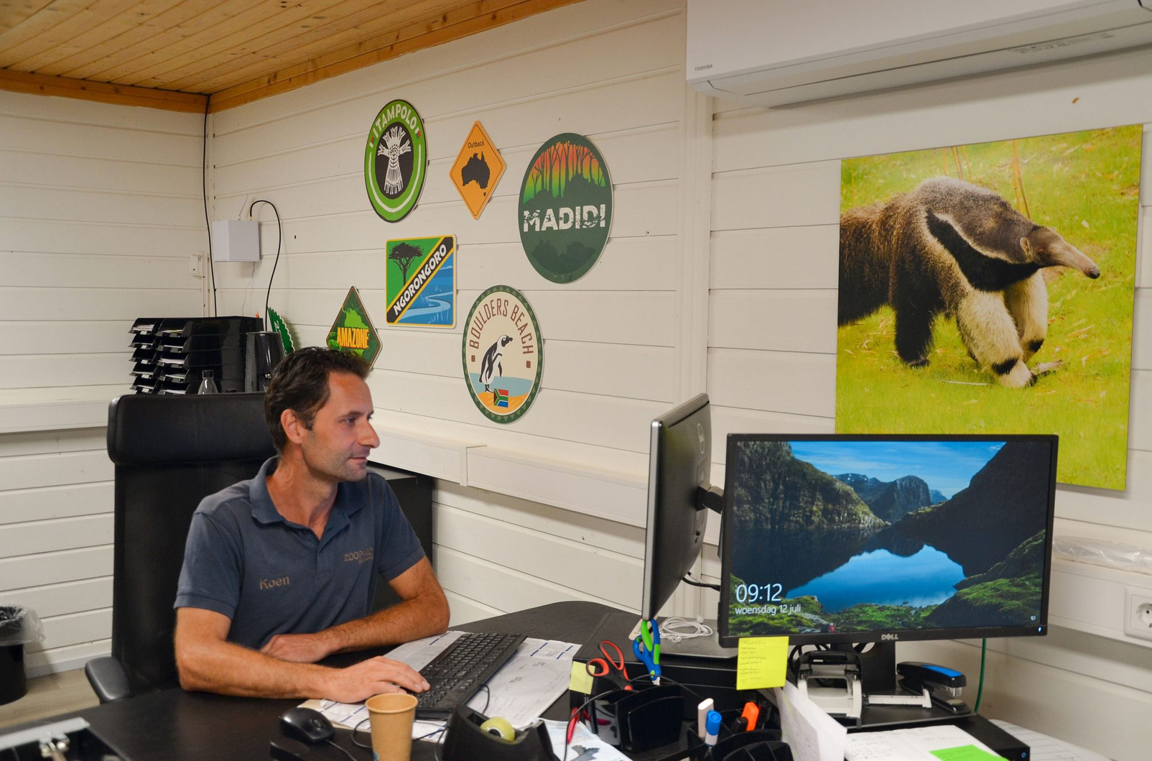 Koen hat eine abwechslungsreiche Tätigkeit, er arbeitet regelmäßig im Büro, aber auch bei den Tieren. Im Büro kümmert er sich vor allem um den Transport der Tiere, die Einrichtung der Grünflächen und die (medizinische) Tierverwaltung. Hier wird erfasst, welche Tiere geboren werden, wer die Eltern sind, welche Chipnummer das Tier hat, ob es Medikamente bekommt und ob jemals Röntgenbilder gemacht wurden. Er hat auch viel Kontakt mit Tierärzten und anderen Zoos im Zusammenhang mit Zuchtprogrammen, so dass viele Informationen ausgetauscht werden und er jedes Mal etwas Neues lernt.