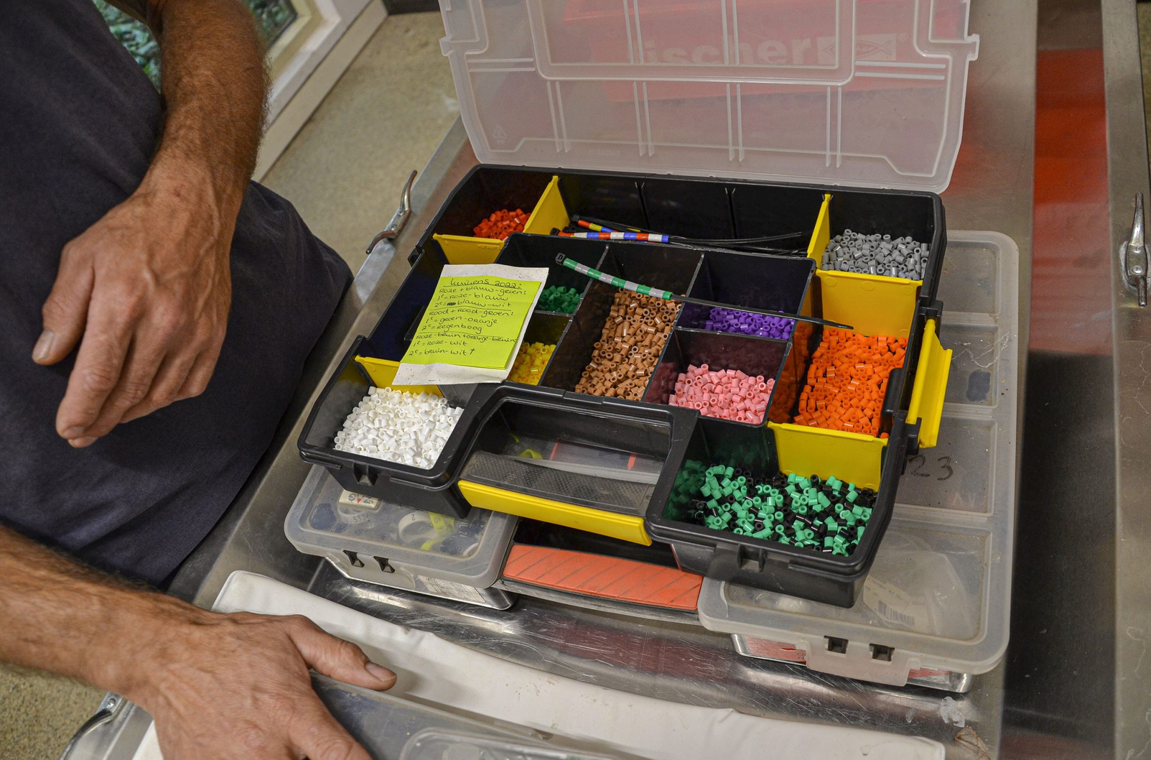 Tiere wie Affen und Giraffen sind etwas leichter anhand persönlicher/äußerer Merkmale zu identifizieren. Bei Tieren, bei denen dies nicht der Fall ist, wie z. B. bei Vogelarten, werden farbige Bänder verwendet. Das haben sich die Tierpfleger selbst ausgedacht! Männchen und Weibchen werden unterschieden, indem die Bänder auf der rechten oder linken Seite angebracht werden, so dass die Tierpfleger schon von weitem erkennen können, um welches Tier es sich handelt. Wenn das Geschlecht noch nicht feststeht, haben die Tiere noch eine Standardzusammensetzung von Farben, die später abgeschnitten und mit den männlichen/weiblichen Farben versehen werden.