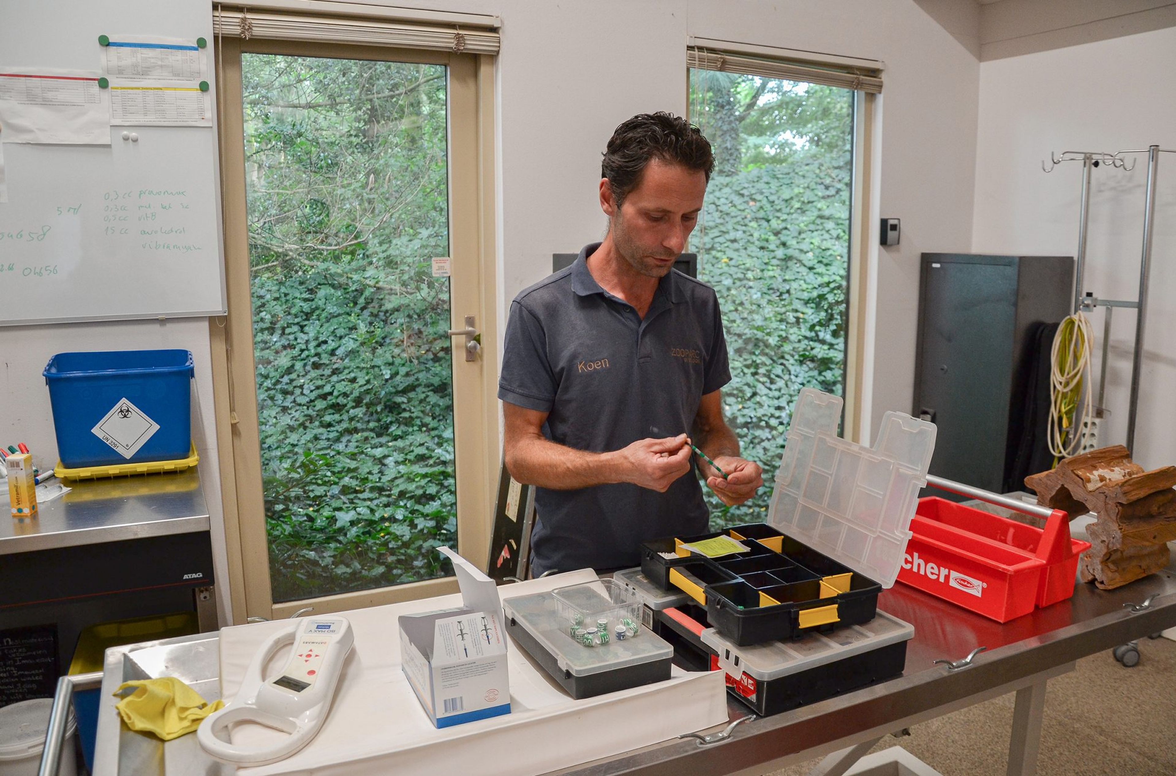In Notfällen ist Koen derjenige, der ein Tier betäubt. Manchmal muss dies mit einem Blasrohr oder einem Gewehr geschehen. Das ist oft bei Tieren der Kategorie A der Fall. Ein Blasrohr wird dann nicht nur bei Löwen und Tigern eingesetzt, sondern zum Beispiel auch bei Rehen! Rehe sind sehr scheu und man kommt nicht an sie heran. Deshalb werden Rehe, Löwen und Tiger oft mit einem Blasrohr betäubt oder mit Medikamenten versorgt.
