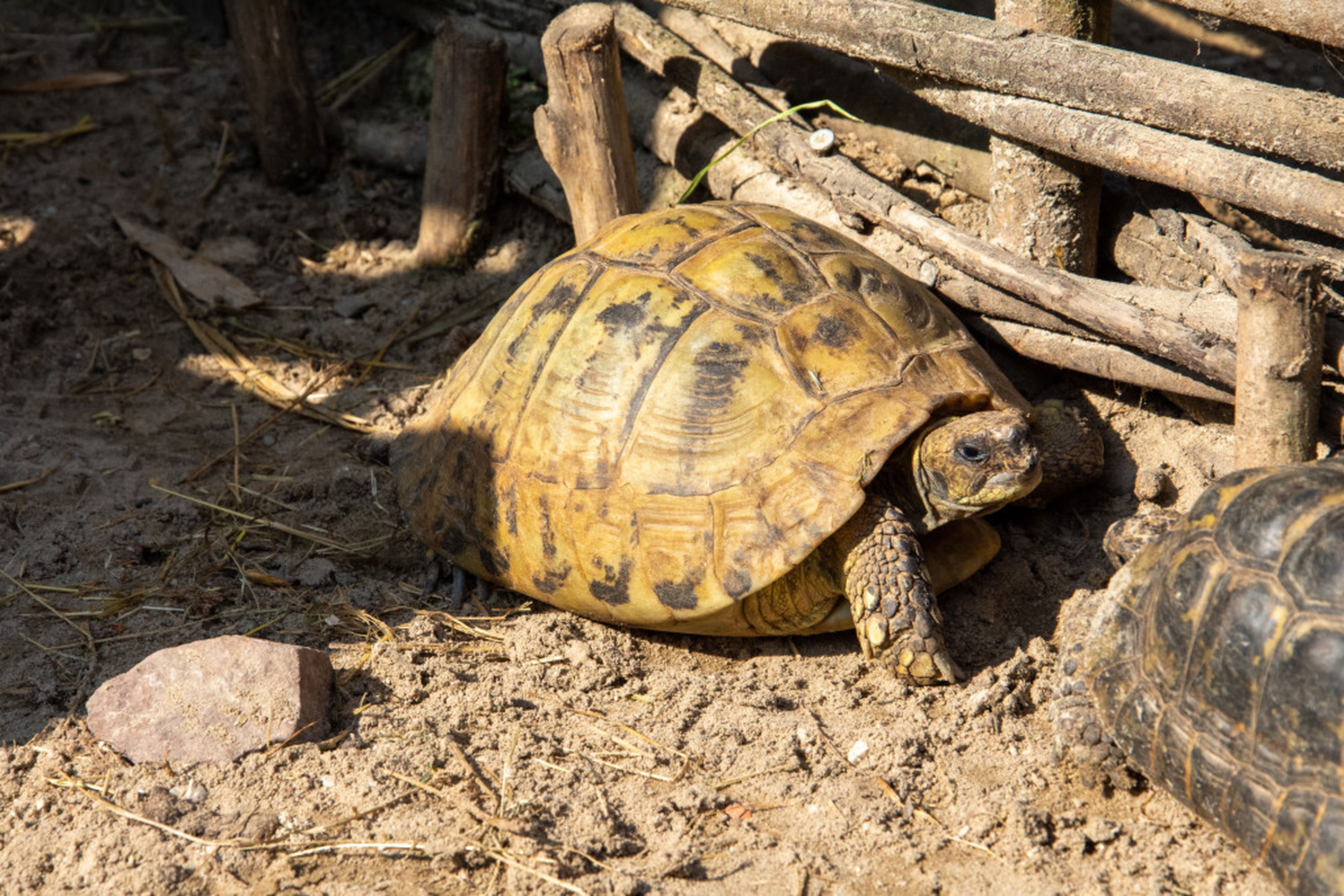 Als een Griekse landschildpad vier jaar is, is het schild helemaal hard geworden. Zo heeft hij een goed pantser waarin hij zich kan terugtrekken bij gevaar. Bosbranden, auto’s en stropers blijven een bedreiging voor deze dieren.